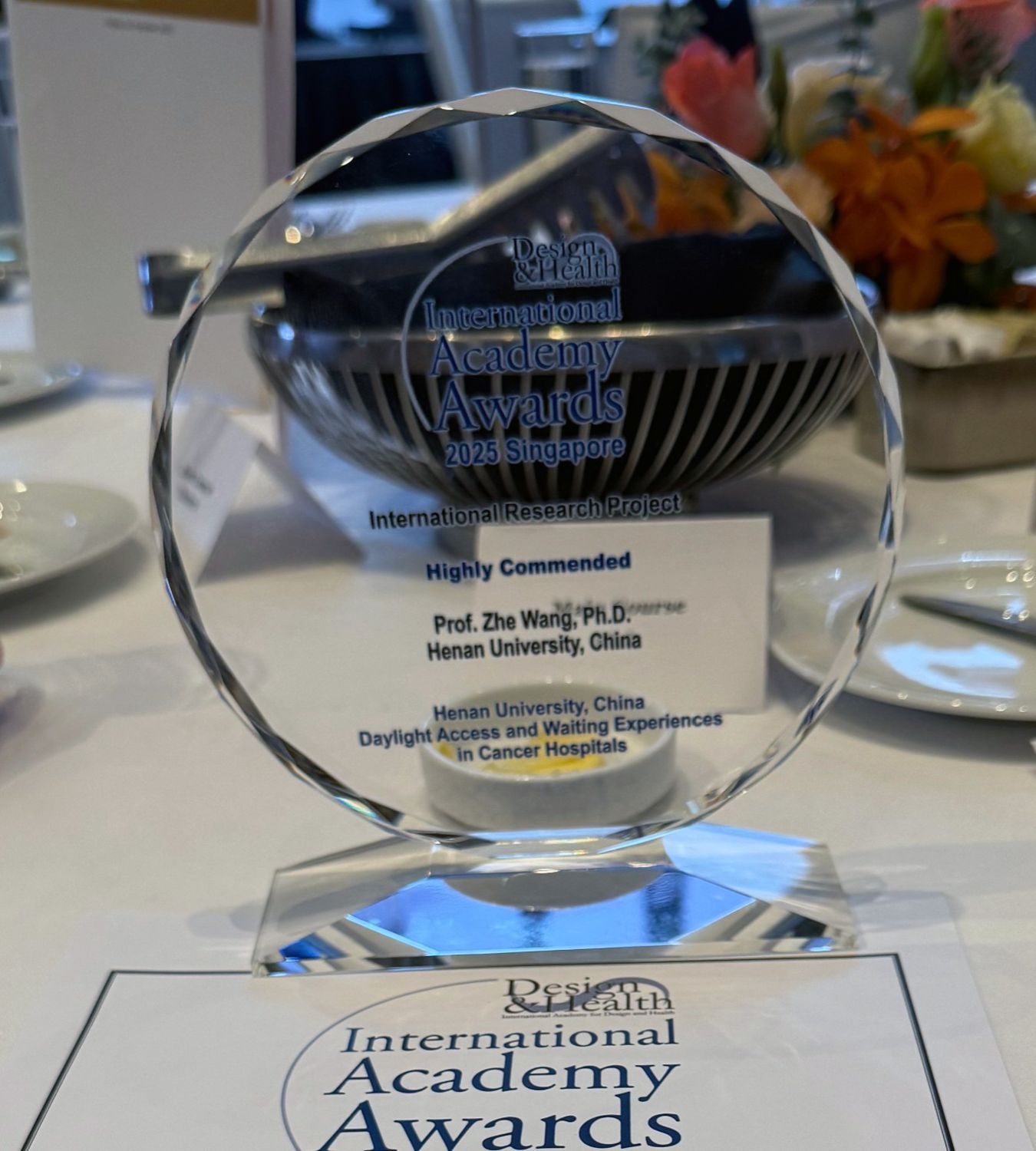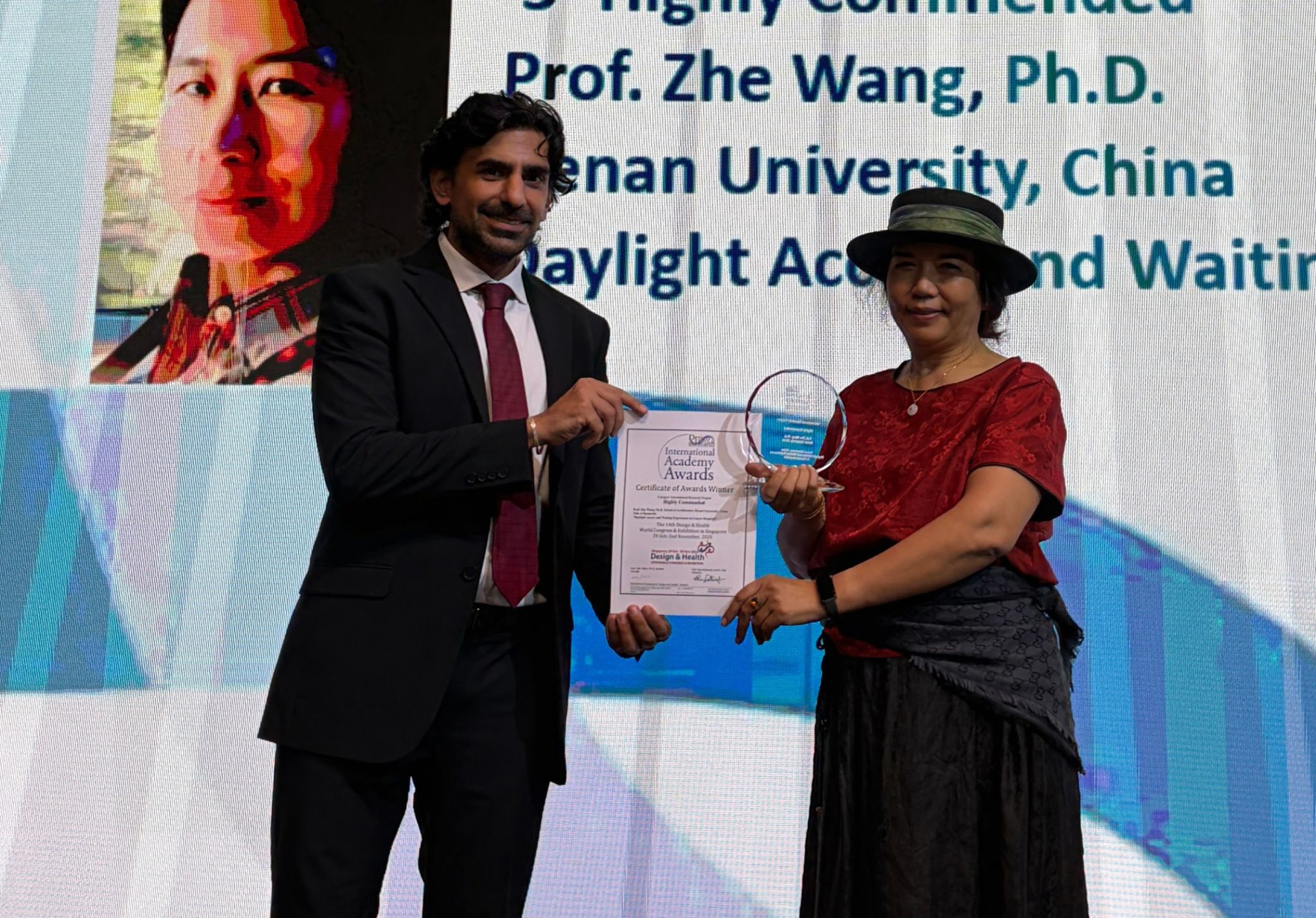 大奖(International Academy Award for Academic Research Project)。这是该奖项在“国际学术研究项目”类别中的最高荣誉,全球仅三位获奖者,充分彰显了王教授在全球健康设计领域的学术影响力,也标志着河南大学在国际学术舞台上的又一次重要突破。