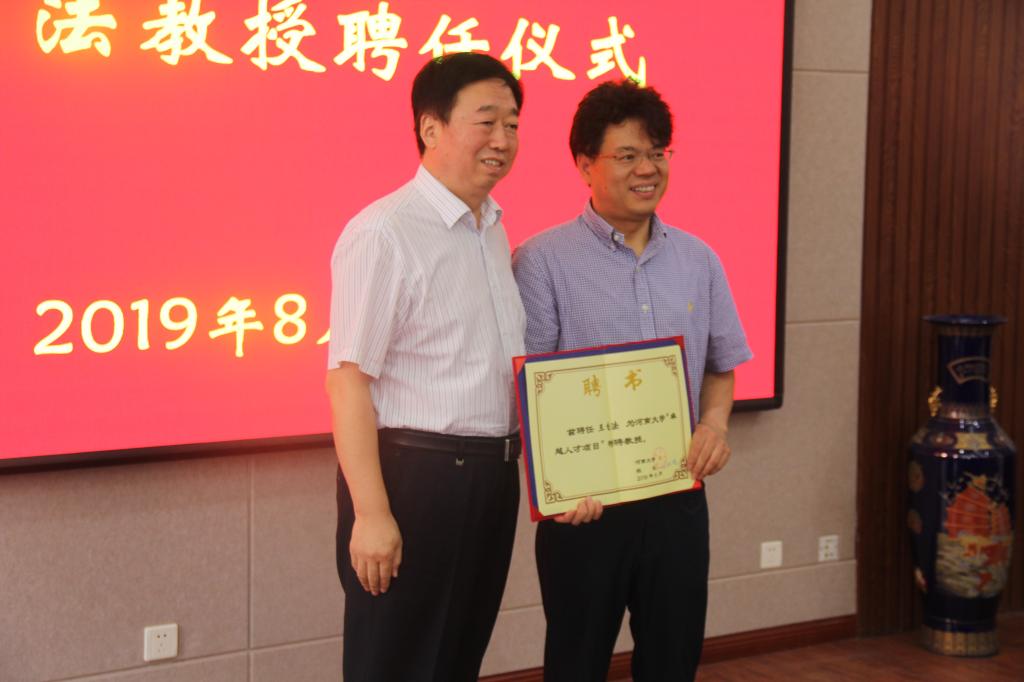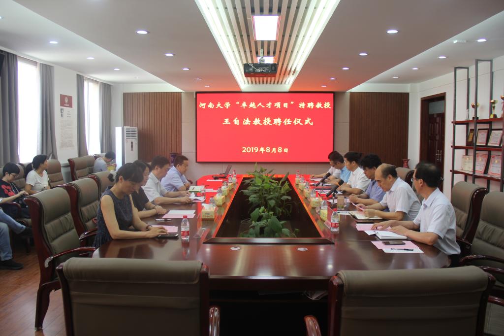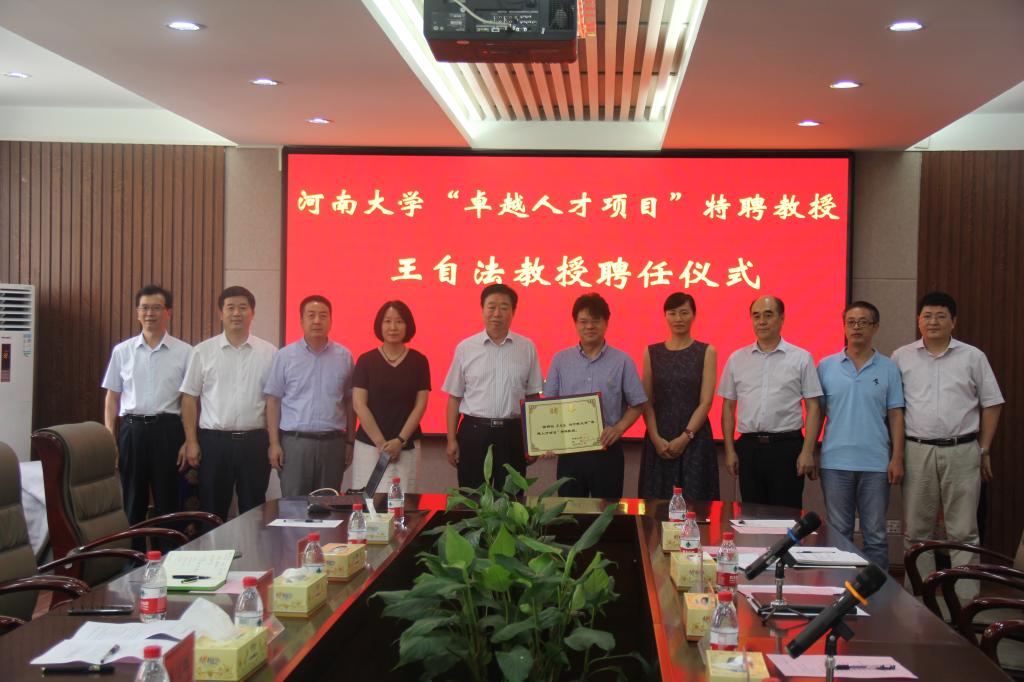 近年来在科研、社会服务方面取得了一定的突破,要在高层次人才引进方面树立一面旗帜,用旗帜去导向各项工作,最后他指出学校各部门和受聘单位要爱惜人才,全力为王教授提供后勤保障,并祝王教授在河南大学工作顺利。