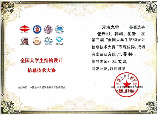 共有四个团队参加大赛,通过6个月坚持不懈的拼搏努力和团队配合,高质量地完成了BIM结构设计的全过程并提交作品,最终在全国高校891份有效作品中脱颖而出。由贺子奇老师指导的3个团队,分别为李文、付佳欣、张赵依组成的“建筑强心脏”队荣获一等奖,王欣飞、郝梦祥、邵佳奇组成的”BIMboys”队荣获三等奖,由麻赟东、宋涛、辛义文组成的“星星小队”荣获三等奖;由杜文风老师指导的1个团队,董尚斌、韩闯、岳浩组成的“嵩岳“队荣获二等奖。