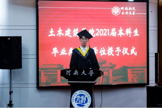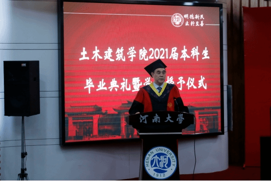 党委书记李社教向毕业学子送上了最诚挚的祝福。李书记声情并茂地讲述了自己与本届毕业生所经历的故事,并对他们所取得的成绩表示由衷的自豪。他还向即将毕业的同学们对未来提出三点希望:第一,希望同学们永葆进取之心,志存高远,追求卓越;第二,希望同学们坚守责任之心,勇于担当,甘于奉献;第三,希望同学们常怀感恩之心,热爱生活,坚定信念。最后,李书记以河南大学百年校庆主题歌《爱在百年》歌词作以结尾:“风吹了,雪飘了,爱已生根了;风停了,雪化了,爱已发芽了;来了,走了,爱已开花了;冬去了,春来了,爱已长大了”。