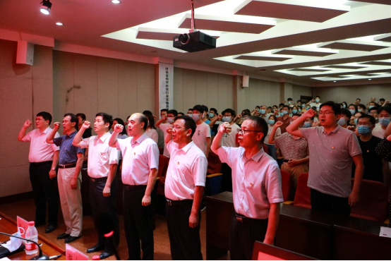 大会在庄严肃穆的国歌中拉开序幕。在党委办公室主任魏森杰老师的领誓下,大家举起右手,神情庄严,重温入党誓词,铿锵有力的声音充满了整个会议室。