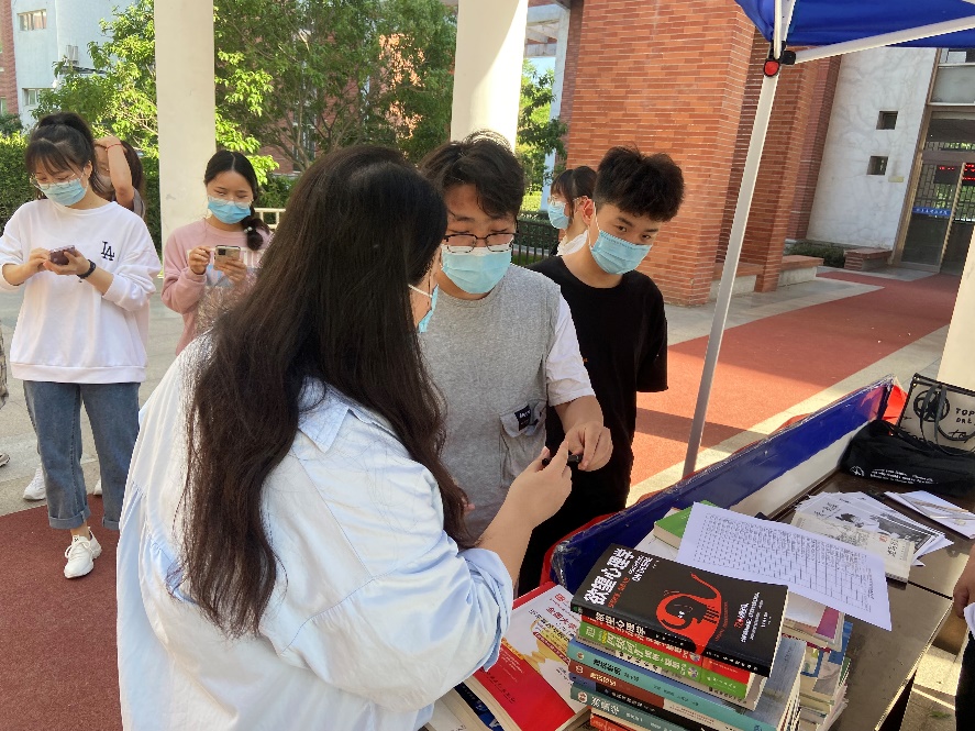在圆形广场下,前来捐书的同学们依次排队等候登记信息。捐献后认真讨论相关图书的内容和彼此阅读后的感受。现场井然有序,氛围良好。
