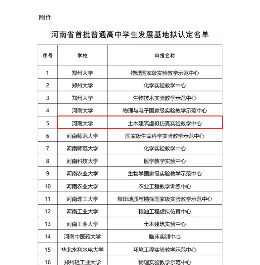 为深入推进普通高中新课程改革和高考综合改革,丰富普通高中学生发展实践场所,持续提升普通高中学科建设水平,加强学生学科素养培养,根据《河南省教育厅办公室关于遴选首批河南省普通高中学生发展实践基地的通知》(教办基〔2022〕112号)文件要求,经学校推荐、省级评审,足球比赛比分 土木建筑虚拟仿真实验教学中心被认定为首批河南省普通高中学生发展基地。