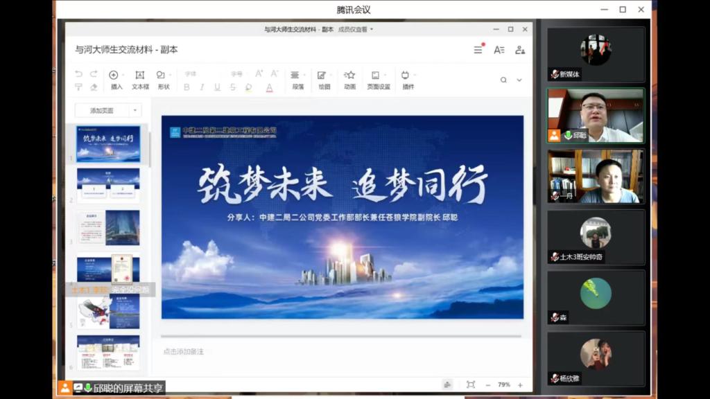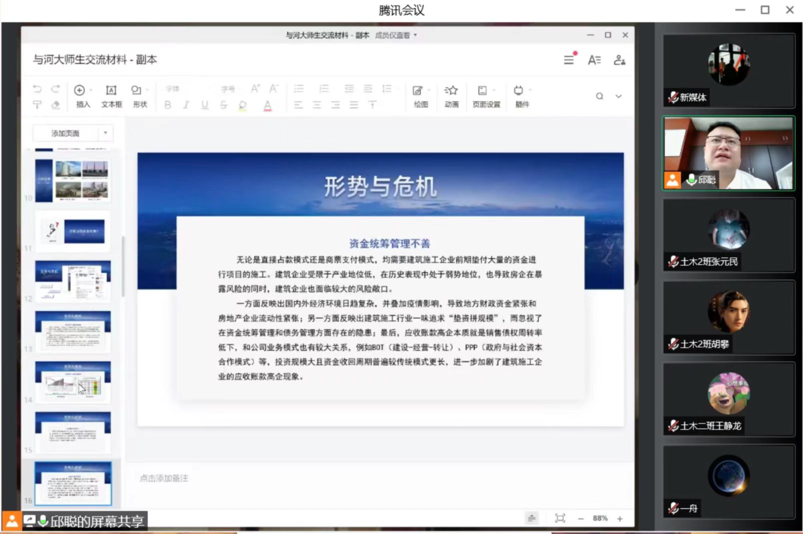 首先,邱先生简要介绍了中建集团的概况和中建二局的发展历史,分析了当前建筑行业发展趋势。接着,他以房地产低迷和身边实时热点切入主题,从地产行业下行、传统建筑业现状和疫期影响等几个方面,深度剖析土木建筑行业的形势与危机。他强调,应上看国家战略和宏观政策,下观经济热点和行业形势,提醒学生们要以长远目光看待专业、审视未来,科学规划大学生涯。他进一步谈到,从建筑业的机遇和发展方向出发,环保材料、智能建造、智慧交通、创新设计、建筑运维等将是行业改革发展方向,同时,要完善工程承包模式,建立全产业链思维。最后,他从企业角度,讲述了人才成长路径,强调了职业生涯规划的重要性,鼓励青年大学生坚定专业信心,时时关注行业发展动态,锚定努力方向,收获充实而又愉快的大学生涯。