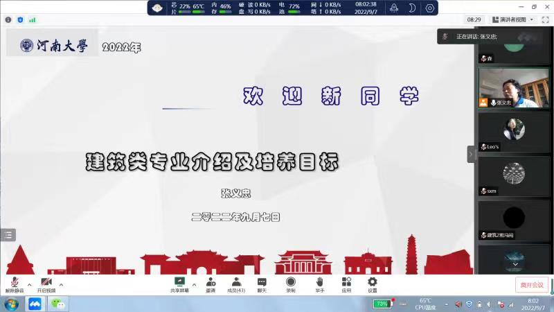 9月8日上午,地下空间系主任边汉亮介绍了土木工程专业的培养目标、毕业要求、课程体系,最后给新生们提出要有目标、多听多读多参与、多运动等三个大学生活的建议;黄河学者王哲以一些著名建筑和建筑师为例,引出建筑学发展前沿的主题,总结出将建筑学学好的四字要诀:“能想、会干”。鼓励新生们能思想、会实干,从自身角度出发,总结出建筑学的前沿。