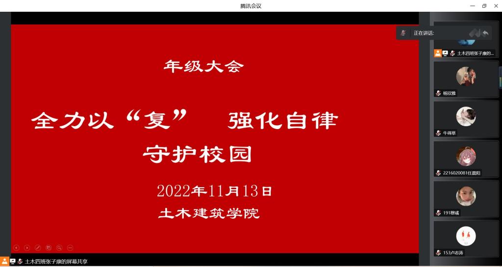 2022级本科生开展了以“全力以’复’、强化自律、守护校园”为主题的班会。