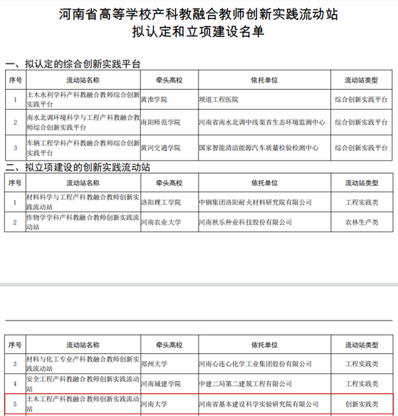 根据河南省教育厅《关于河南省本科高校产科教融合教师创新实践流动站评审结果的公示》,由河南大学牵头、河南理工大学和河南工业大学参与,依托河南省基本建设科学实验研究院(集团)有限公司申报的“土木工程产科教融合教师创新实践流动站”(简称“创新实践流动站”),成功立项为河南省本科高校产科教融合教师创新实践流动站。此次全省拟立项建设创新实践流动站27个,河南大学、郑州大学各被立项2个。