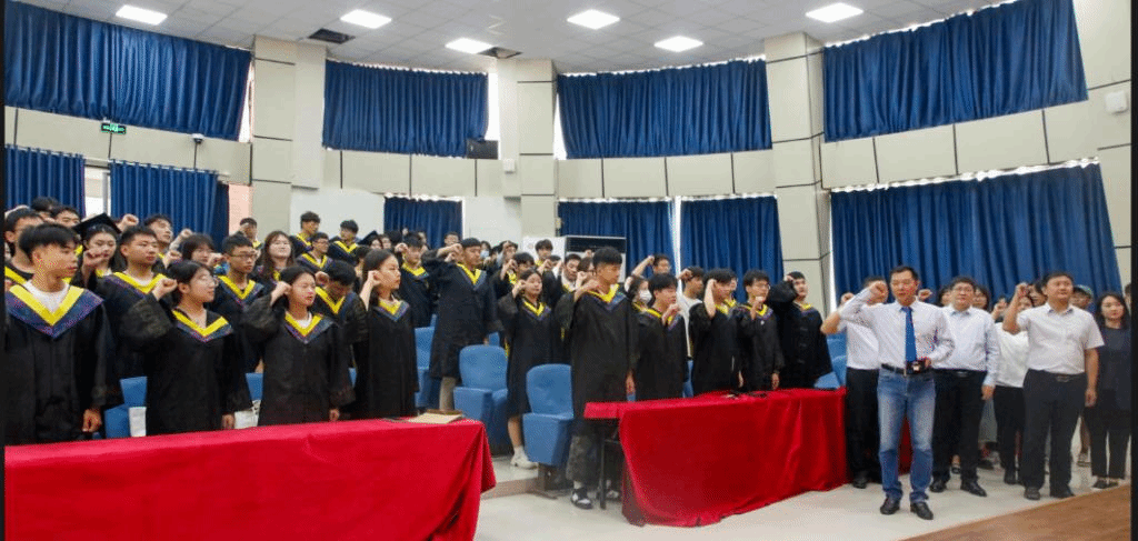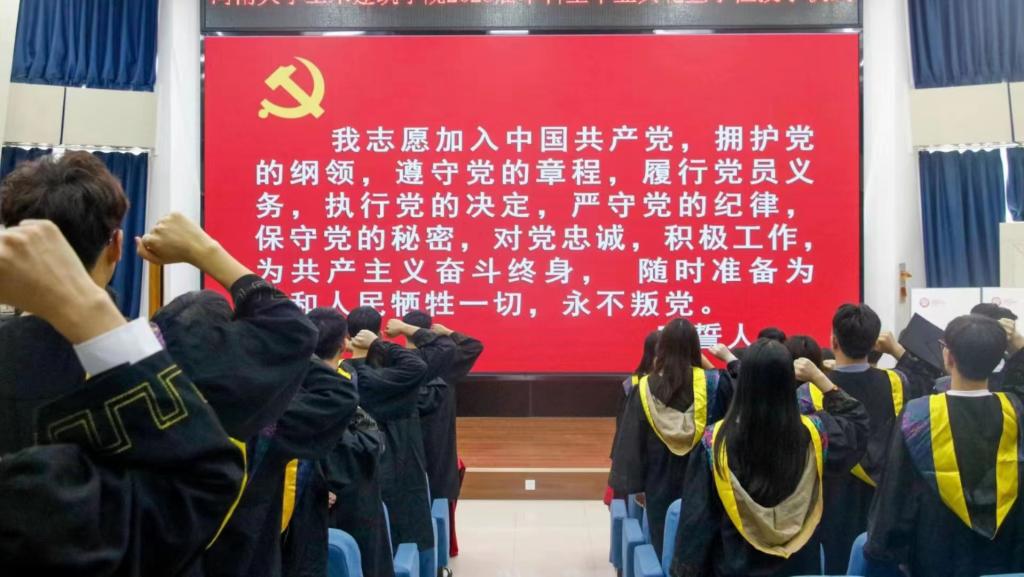 党委书记南晗同志的带领下,全体师生党员举起右拳,庄严宣誓。在一句句慷慨激昂的誓词里,毕业生党员将牢记初心使命,为党旗增辉。