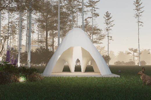 二等奖作品将巢穴的洞穴感和未来的流线感进行融合,表达着自然、原始与未来的对话,追寻自然建筑与生态建筑,创造了一个编织流线状景观,探索不同尺度曲线在建筑中的活力表达。