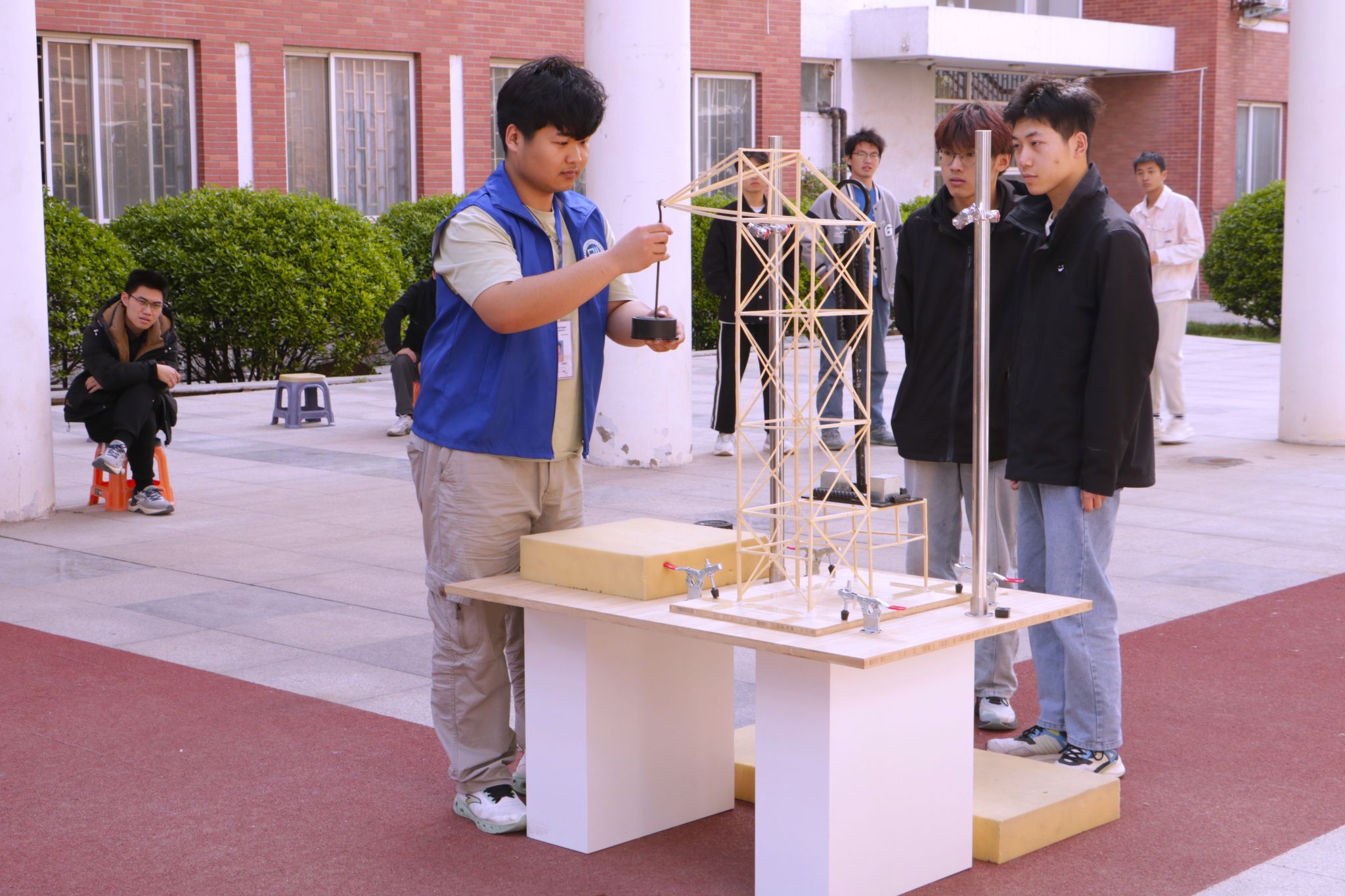 在圆形广场举行结构模型设计竞赛。专业教师杜文风、张慧、孔庆梅、张静、刘清山担任评委。