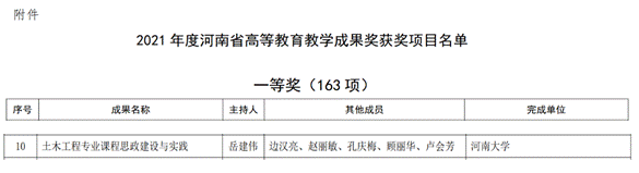 近日,河南省教育厅公布了2021年省级高等教育教学成果奖获奖项目名单。足球比赛比分 由岳建伟教授主持的《土木工程专业思政建设与实践》获河南省高等教育教学成果奖一等奖。