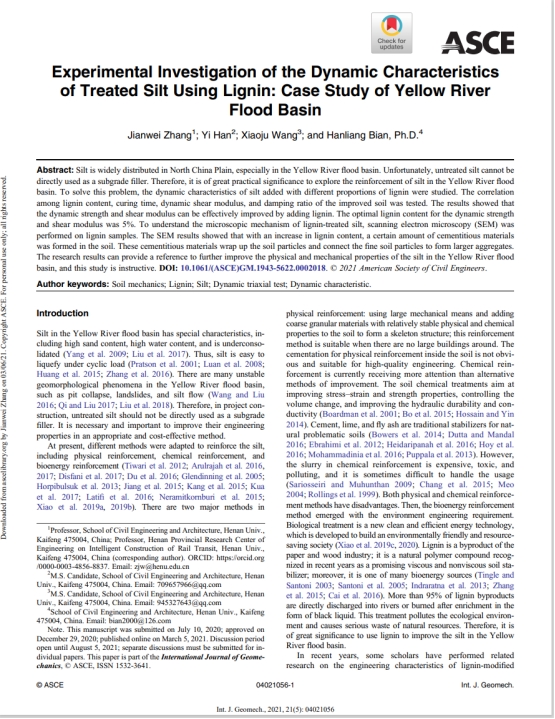 张建伟教授研究团队在国际岩土工程类知名期刊《International Journal of Geomechanics》(中科院3区,影响因子2.474)上发表题为“Experimental Investigation of the Dynamic Characteristics of Treated Silt Using Lignin: Case Study of Yellow River Flood Basin”的研究论文。