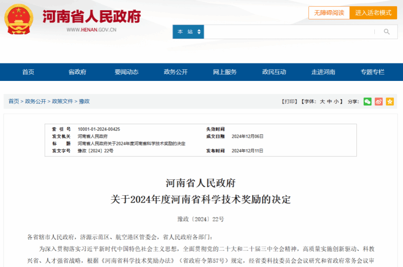 2024年12月9日,河南省科学技术奖励大会召开,公布《河南省人民政府关于2024年度河南省科学技术奖励的决定》(豫政〔2024〕41号),足球比赛比分