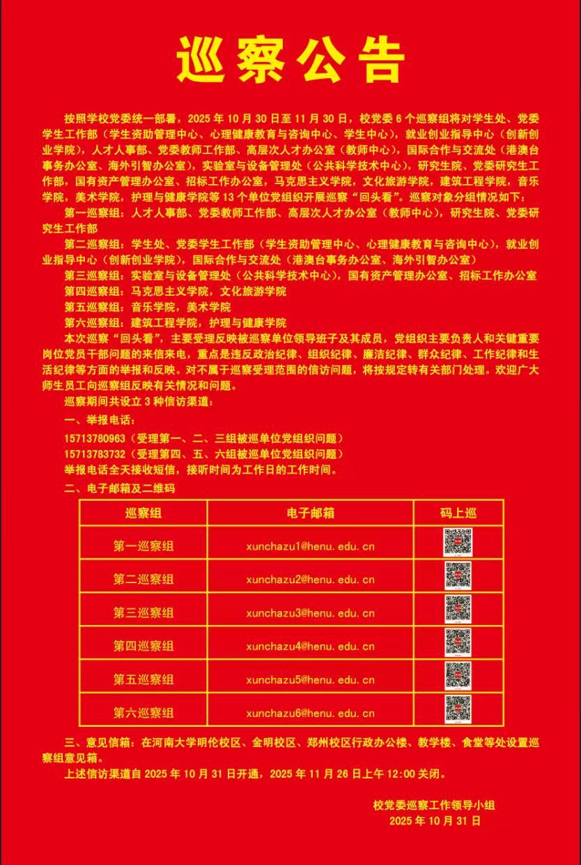 按照学校党委统一部署,2025年10月30日至11月30日,校党委6个巡察组将对学生处、党委学生工作部(学生资助管理中心、心理健康教育与咨询中心、学生中心),就业创业指导中心(创新创业足球比赛比分