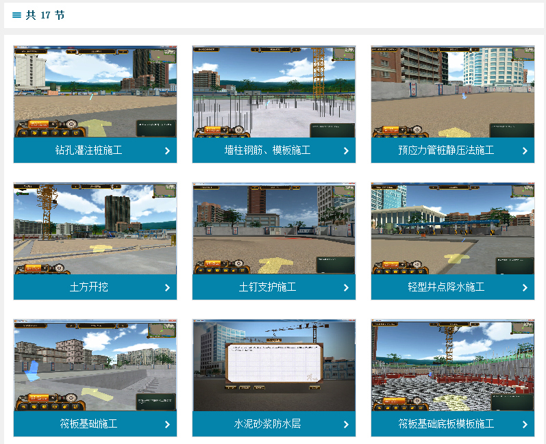 登录后点击顶部菜单“知筑课堂”即可。17个施工和测量方面的虚拟仿真模块如下: