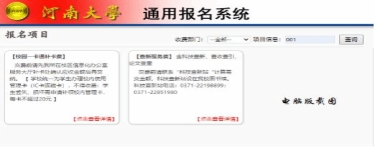自主选择项目,登录(新用户需注册)后使用微信或者支付 宝交费(收款方:河南大学)。