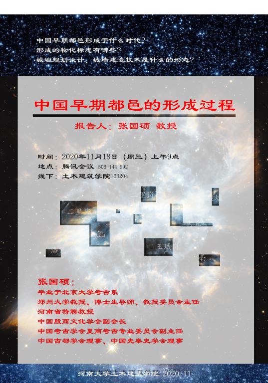 On the morning of November 18, 2020, Professor Zhang Guoshuo of Zhengzhou University was invited to give an online academic lecture entitled "the formation process of China's early cities" for our teachers and students. The lecture was presided over by fan Fei, director of the Department of architecture, and attended by teachers and students of relevant majors.
