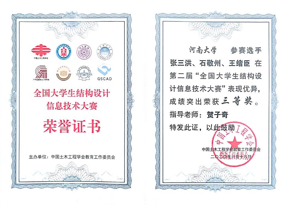 On June 30, the winners of the second "National College Students' structural design information technology competition" sponsored by the Education Committee of the Chinese society of civil engineering were announced. Led by teacher he Ziqi, the "three smelly cobblers" team composed of 2017 undergraduate students Zhang Sanhong, Shi Jingzhou and Wang Xuchen won the third prize in this competition.