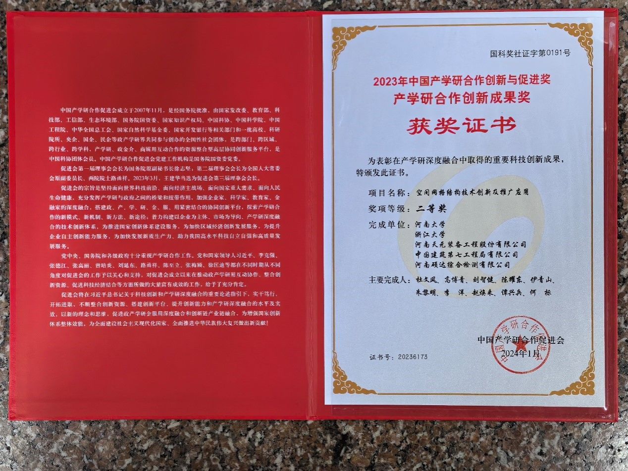 杜文风教授作为第一完成人牵头申报的“空间网格结构技术创新及推广应用”获2023年中国产学研合作创新成果奖二等奖。