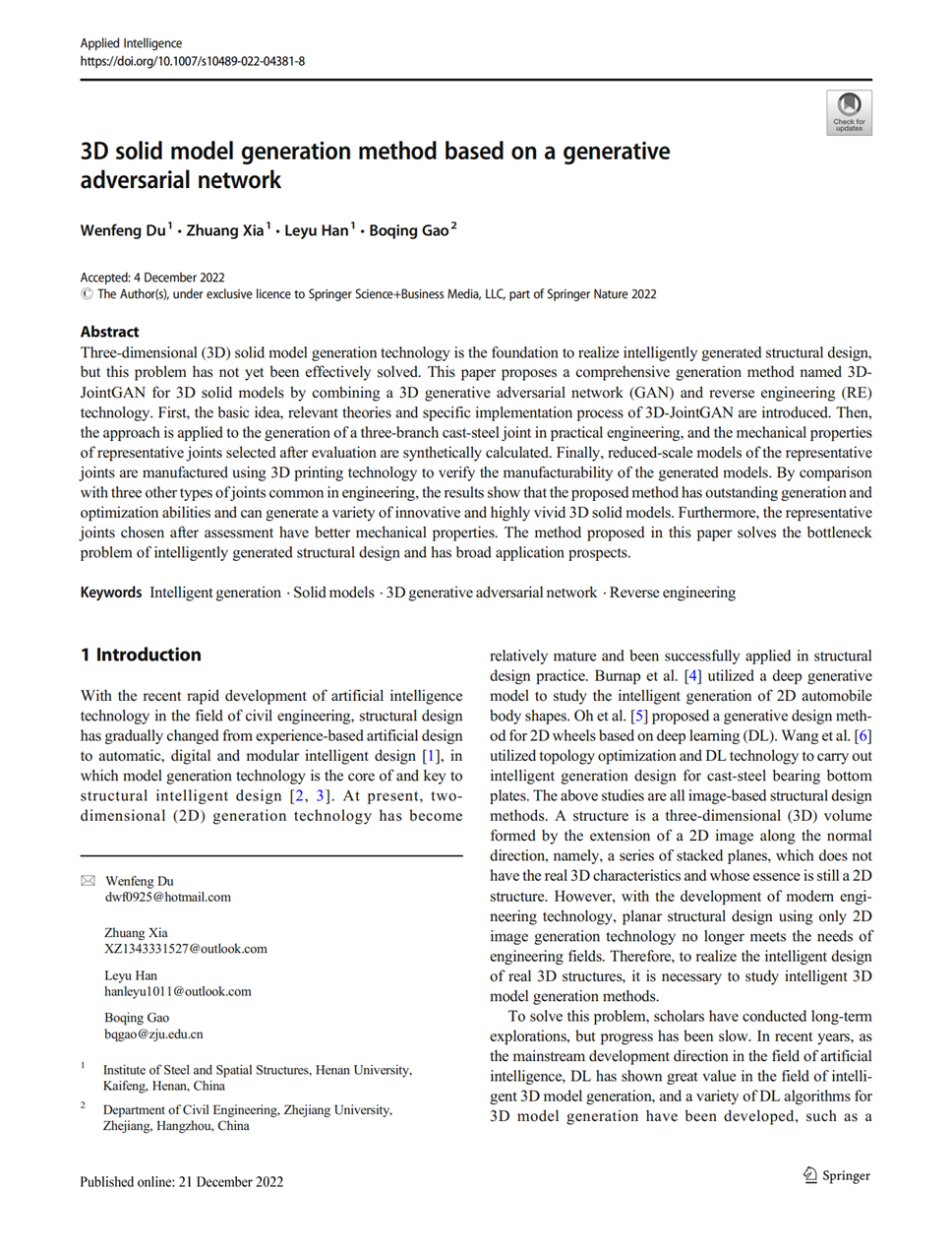 2022年12月,杜文风教授课题组2020级学术型硕士研究生夏壮同学在计算机科学类国际知名期刊《Applied Intelligence》(中科院2区)上发表题为“3D Solid Model Generation Method Based on a Generative Adversarial Network”的研究论文,该论文的通讯作者是其导师杜文风教授。