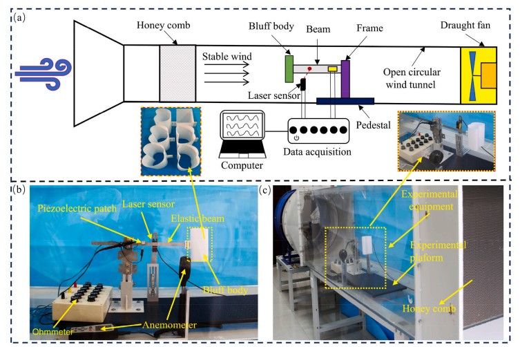 图 3.(a)风洞试验的总体视图,(b)在风洞中测试的拟收割机原型,(c)风洞试验装置