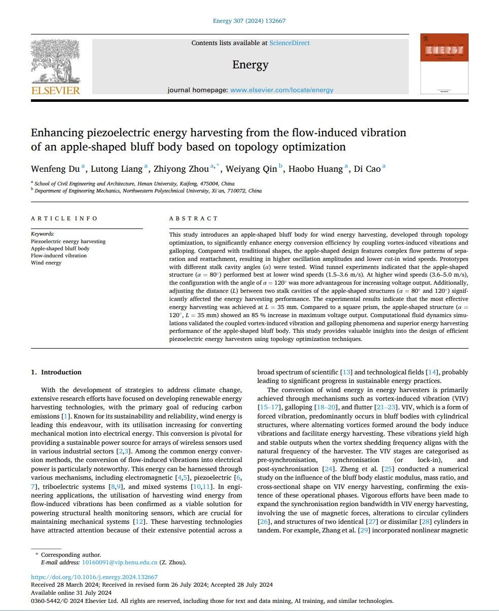 、河南大学钢与空间结构研究所杜文风课题组在国际能源类知名期刊《Energy》(中科院JCR一区期刊,影响因子9)期刊上发表题为“Enhancing piezoelectric energy harvesting from the