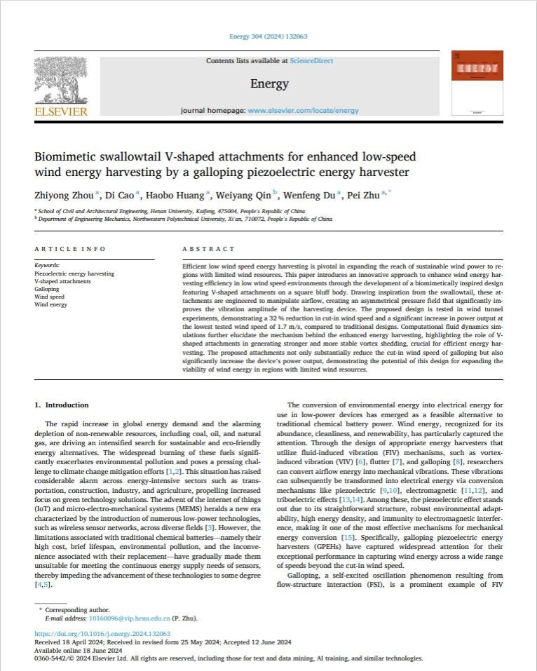 、河南大学钢与空间结构研究所周志勇课题组在国际能源类知名期刊《Energy》(中科院JCR一区期刊,影响因子9)期刊上发表题为“Biomimetic swallowtail V-shaped attachments for enhanced low-speed wind energy harvesting by a galloping piezoelectric energy harvester”的研究论文。该研究成果是河南大学土木建筑足球比赛比分