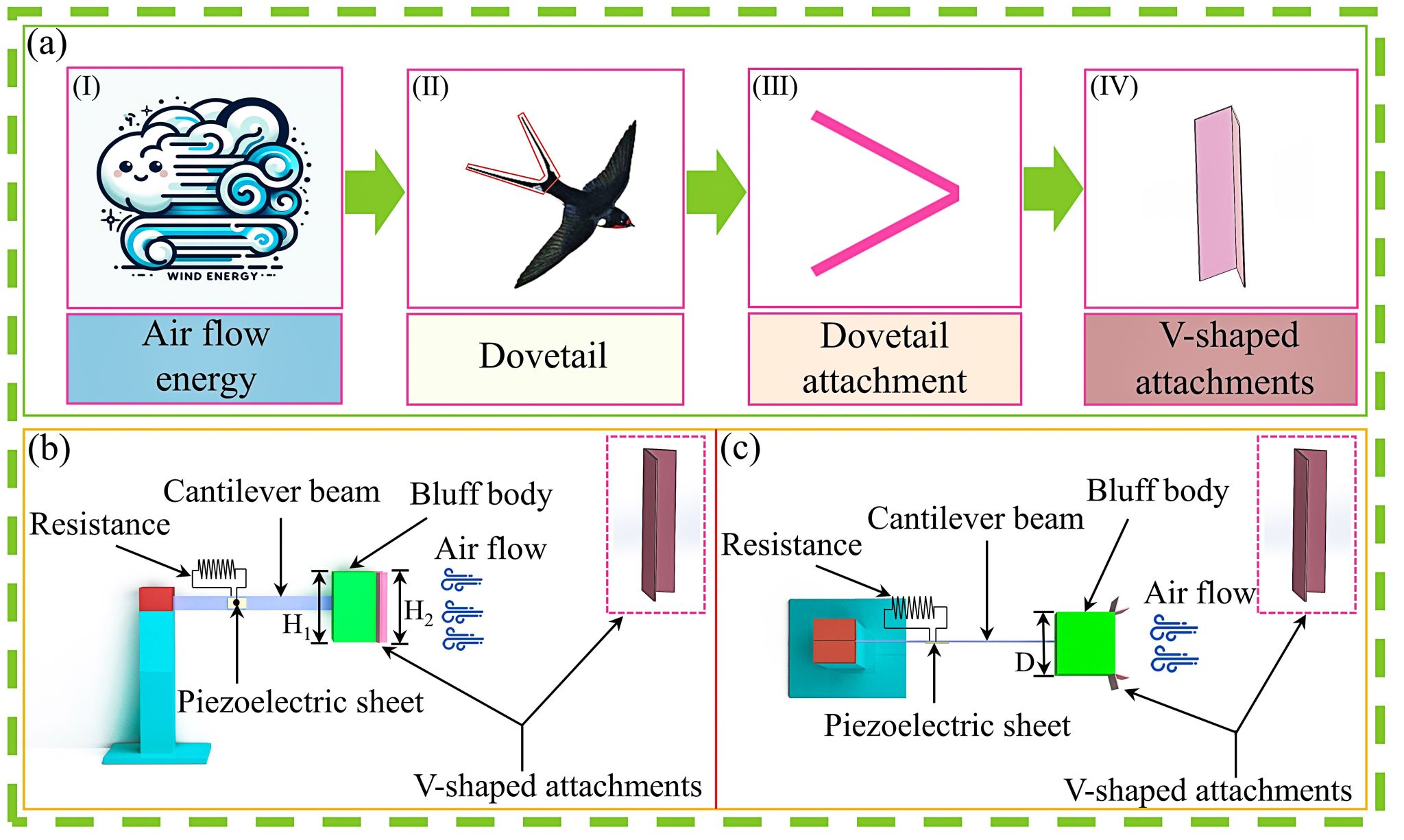 环境风能由于其稳定的供应和巨大的能量容量,被认为是最重要和最有前途的清洁能源之一。近年来,对其的收集利用成为研究的热点。基于风能的采集装置主要可分为旋转涡轮式采集器和风致振动式采集器。风致振动式采集器具有结构简单、体积小等优势,成为目前研究的重点方向。其中,高效的低风速能量收集更是将可持续风力发电扩展到风力资源有限的地区的关键。本研究介绍了一种在低风速环境下提高风能捕获效率的创新方法,该方法通过在方形钝体上添加两根由仿生灵感设计的V形附件设计来提高风能捕获效率。设计的V形附件是从燕尾身上得到灵感,主要用于操纵气流,创造一个不对称的压力场,从而显著改善采集装置的振动幅度。该设计在风洞实验中进行了测试,实验结果表明与传统设计相比,在最低测试风速为1.7 m/s时就开始发生驰振,切入风速降低了32%,功率输出显著增加。计算流体动力学模拟进一步阐明了增强能量收集背后的机制,强调了v形附件在产生更强、更稳定的涡流脱落方面的作用,这对有效的能量收集至关重要。所提出的附件不仅有效降低了采集系统发生驰振的切入风速,而且显著增加了设备的功率输出,表明了这种设计在风能资源有限的地区扩大风能可行性的潜力。