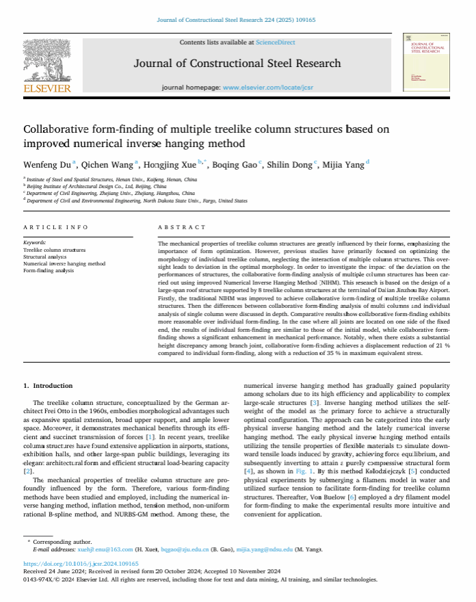 在树状结构整体协同找形领域的探索性成果,北京市建筑设计研究院薛红京正高级工程师、浙江大学空间结构研究中心高博青教授和董石麟院士以及美国北达科他州立大学土木与环境工程系Mijia Yang教授参与了此项工作,河南大学钢与空间结构研究所为第一署名单位,北京市建筑设计研究院为第二署名单位,浙江大学空间结构研究中心为第三署名单位、美国北达科他州立大学土木与环境工程系为第四署名单位。