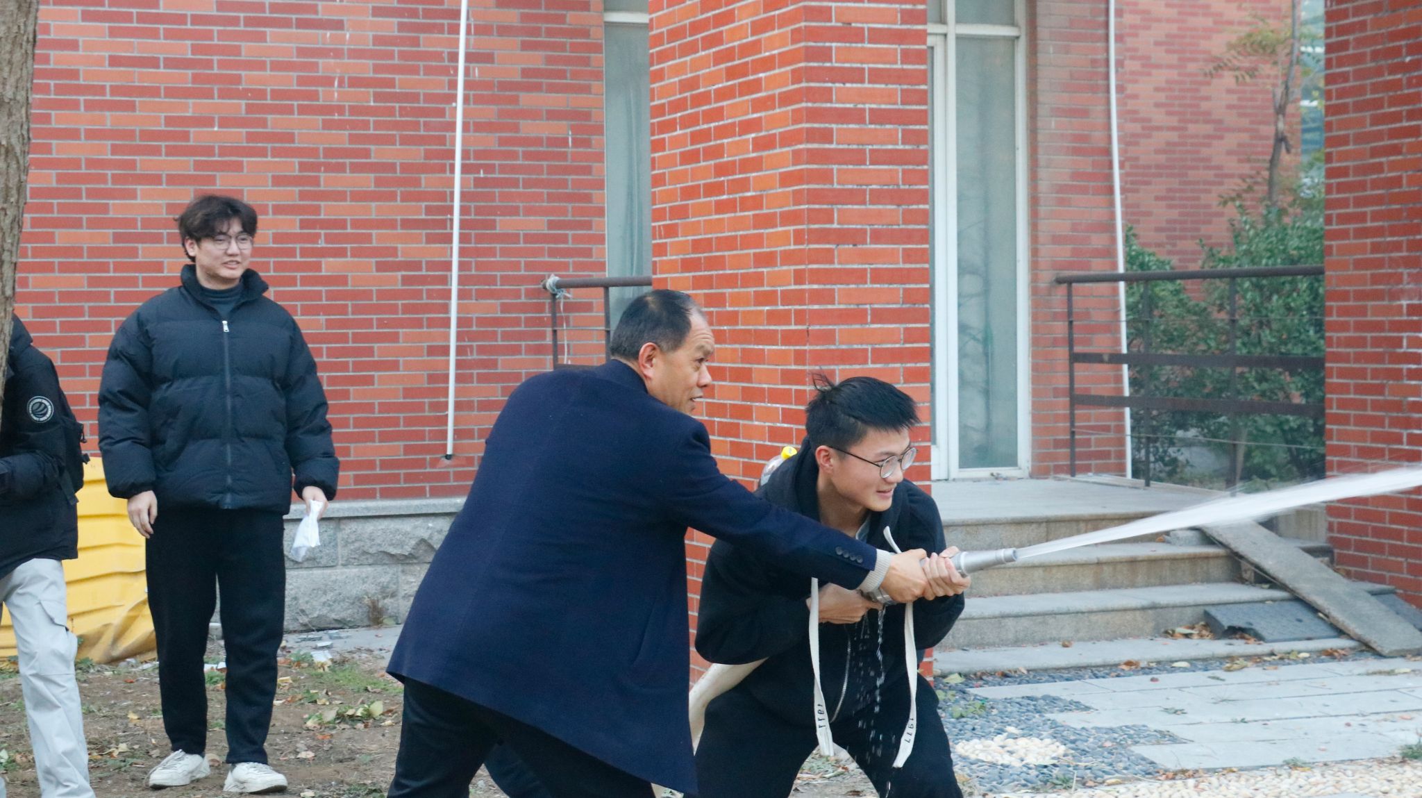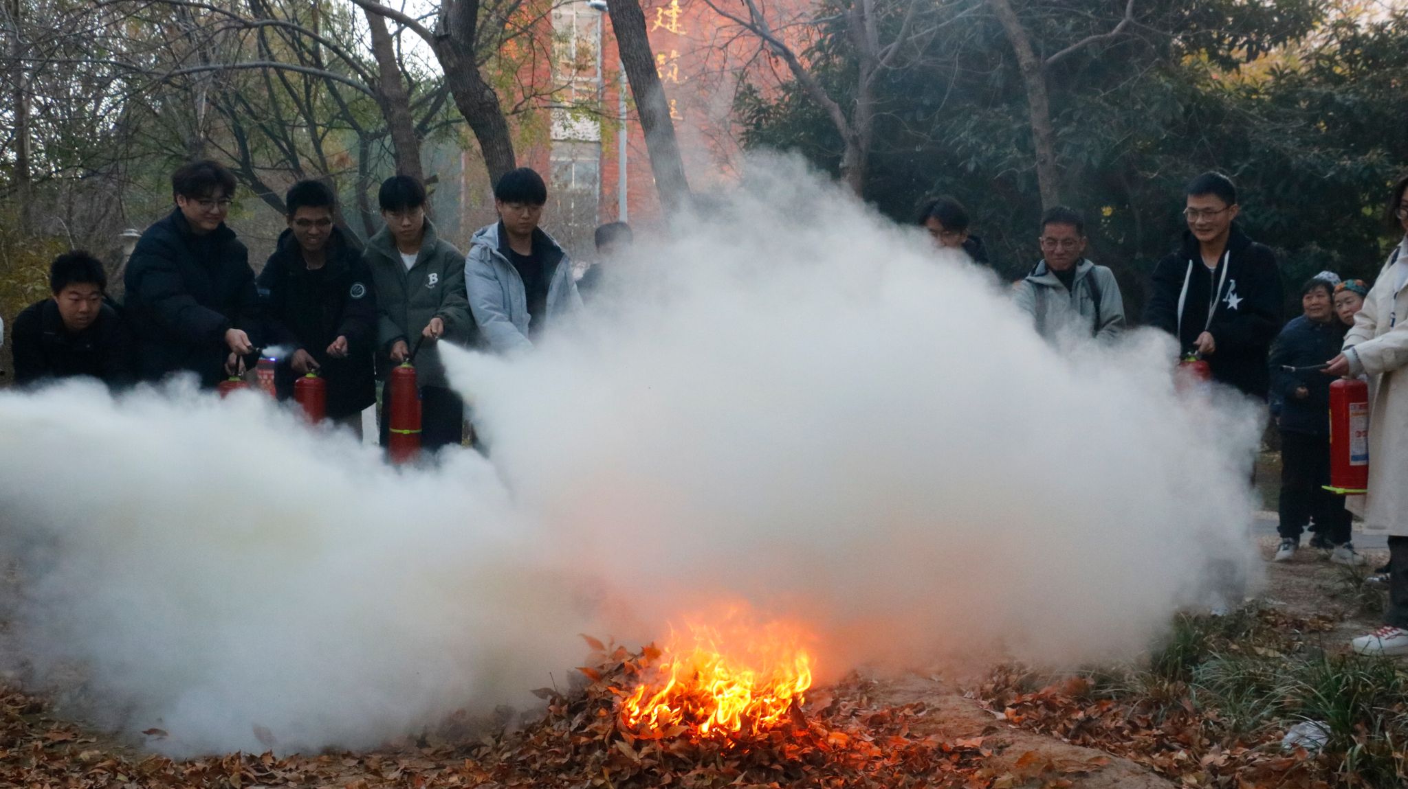 讲解结束后,在场师生进行了消防演练。警报拉响后,师生们迅速响应,学生们在老师的组织下用湿毛巾捂口鼻、弯腰低姿,依预定路线有序撤离教室,快速到达操场安全区域。集合完毕后,大家在结构楼北侧广场依次操作灭火器、消防栓等器材。