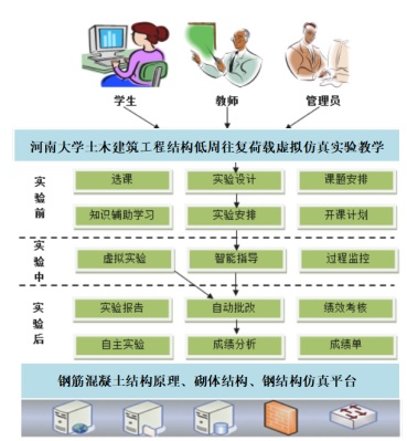 工程结构低周往复荷载虚拟仿真项目的开放运行依托于河南大学土木建筑虚拟仿真实验教学管理平台(网址//civilsimu.zqbisaibf.com)的支撑,二者通过数据接口无缝对接,保证用户能够随时随地的通过浏览器访问该项目,并通过平台提供的面向用户的智能指导、自动批改服务功能,尽可能帮助用户实现自主的实验,加强实验项目的开放服务能力,提升开放服务效果。